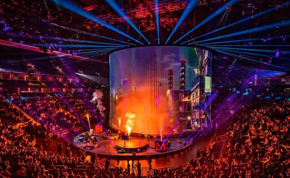 舞台中心有个重大的360°圆柱纱幕,,,,,,,,《绝地求生》的场景一直的在投影幕墙中变换。。。。。。。当投影泛起一架飞机时,,,,,,,,全副武装的特技演员可以从天而将,,,,,,,,他们在枪声一直、烟雾四起的场景中匍匐前进,,,,,,,,手持的假枪枪口部位还设计了烟火特效,,,,,,,,配合着现场破旧的汽车、飘烟的空投和残垣断壁的背景,,,,,,,,真实演绎了游戏中交火的强烈场景。。。。。。。